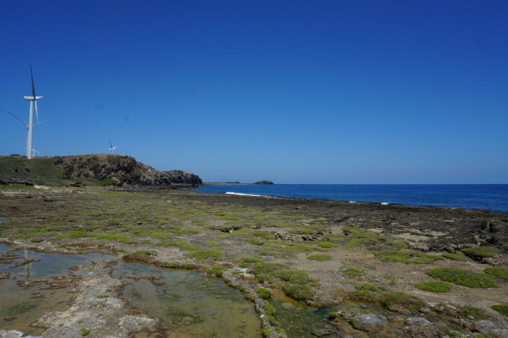 ここも海水は透明だが、風と波が強い。そのせいか辺りには風力発電のタービンもある。