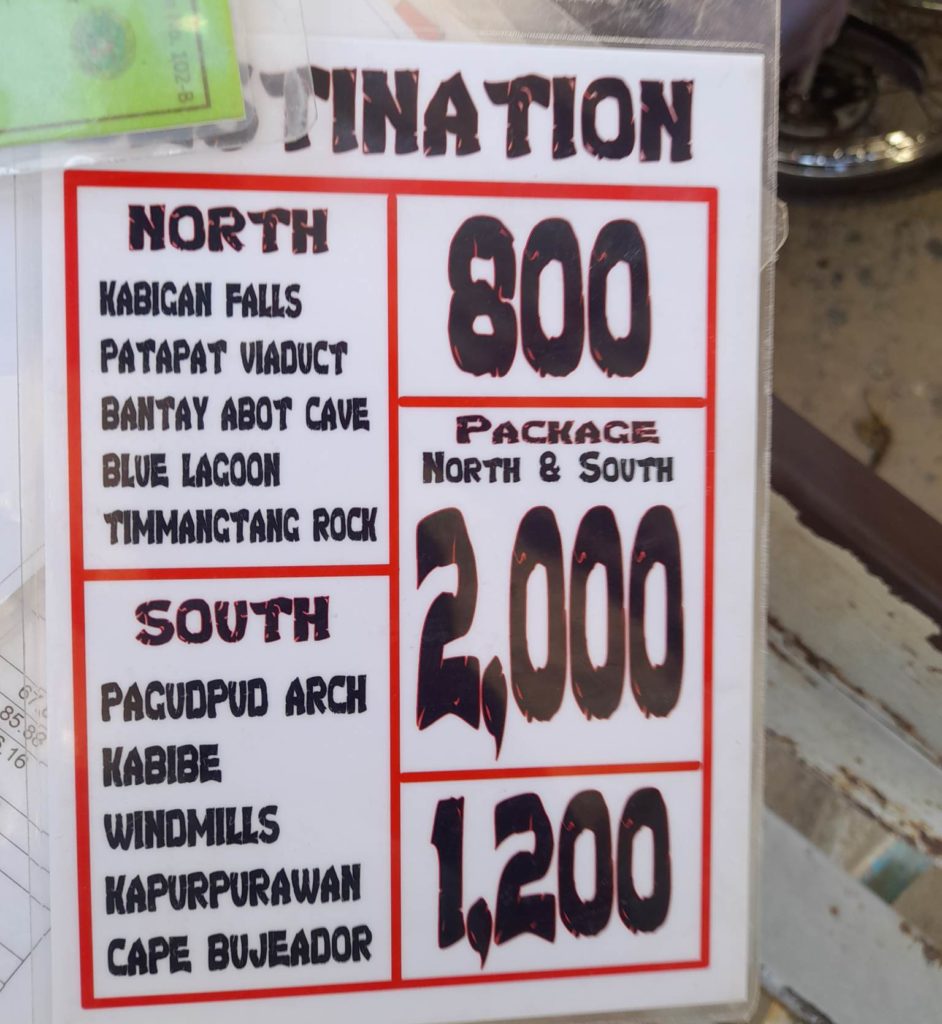 ツアー料金はパグドプッドの北部を回る NorthTour が800ペソ、 南部のSouthTour が1200ペソでどちらも行く場合でも安くならず2000ペソ。南部の方が遠いからなのか料金設定が高い。また、パグドプッドのドライバーは南部のとある場所までしか行く事が出来ないため、南部のトライシクルと乗り換える事になる。おそらく、そこら辺の料金が南部ツアーの金額に反映されているのだろう。